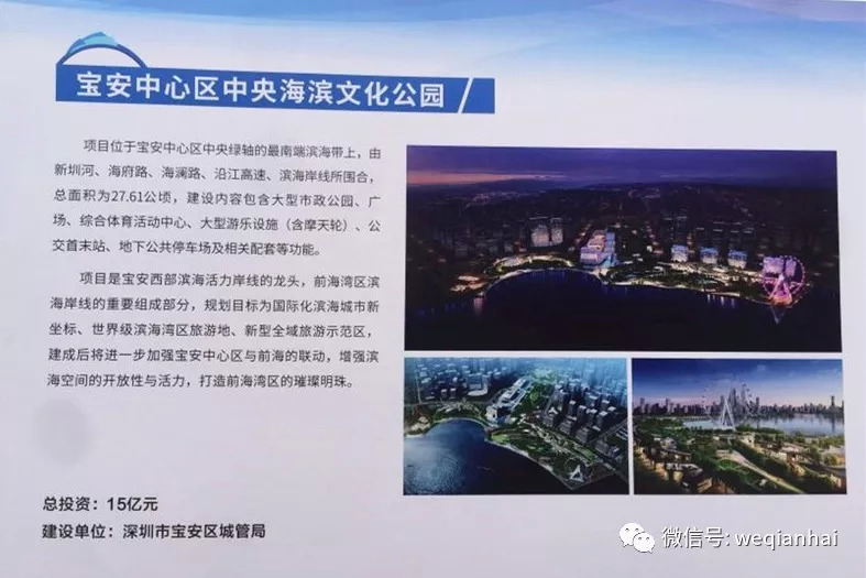 宝安中心区中央海滨文化公园总面积为27.61公顷,项目总投资约15亿元,将建设大型市政公园、广场、综合体育活动中心、大型游乐设施(含摩天轮)、公交首末站、地下公共停车场及相关配套等功能。项目是宝安西部滨海活力岸线的龙头,前海湾区滨海岸线的重要组成部分,规划目标为国际化滨海城市新坐标、世界级滨海湾区旅游地、新型全域旅游示范区,建成后将进一步加强宝安中心区与前海的联动,增强滨海空间的开放性与活力,打造前海湾区的璀璨明珠。