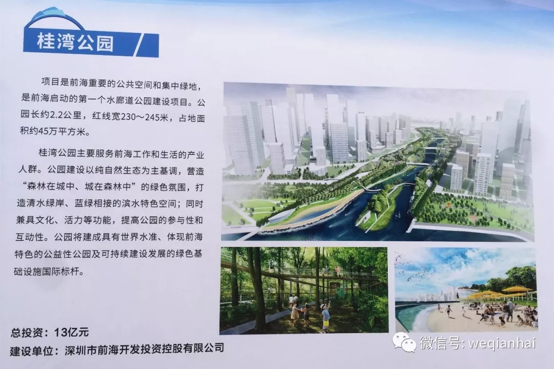 桂湾公园长约2.2公里,占地面积约45万平方米,总投资约13亿元。是前海重要的公共空间和集中绿地,以及前海启动的第一个水廊道公园建设项目。桂湾公园主要服务前海工作和生活的产业人群,公园建设以纯自然生态为主基调,营造“森林在城中、城在森林中”的绿色氛围,打造清水绿岸、蓝绿相接的滨水特色空间;同时兼具文化、活力等功能,提高公园的参与性和互动性。公园将建成具有世界水准、体现前海特色的公益性公园及可持续建设发展的绿色基础设施国际标杆。