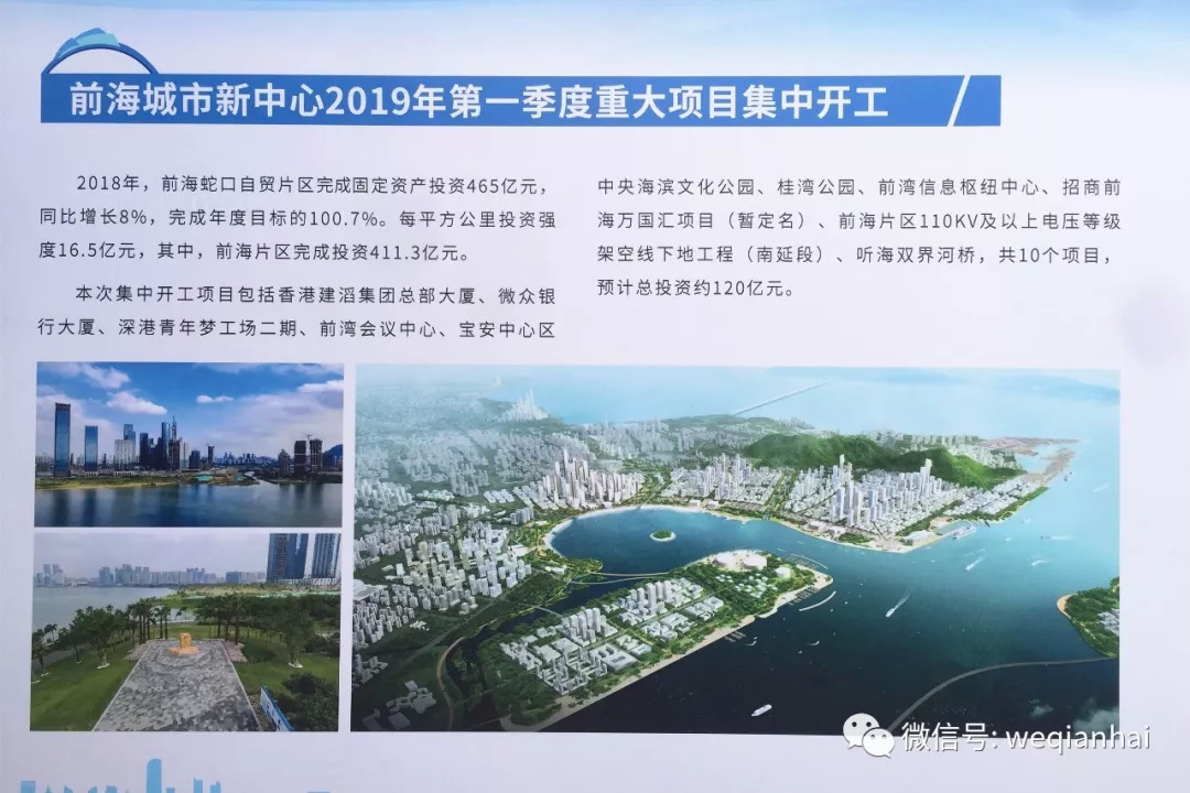数据显示,2018年,前海蛇口自贸片区固定资产投资465亿元,同比增长8%,完成年度目标100.7%。每平方公里投资强度16.5亿元,其中,前海片区完成投资411.3亿元。本次集中开工的前海城市新中心建设项目包括香港建滔集团总部大厦、微众银行大厦、深港青年梦工场二期、前湾会议中心、宝安中心区中央海滨文化公园、桂湾公园、前湾信息枢纽中心、前海万国汇项目(暂定名)、前海片区110KV及以上电压等级架空下地工程(南延段)、听海双界河桥等10大项目,预计总投资约120亿元。