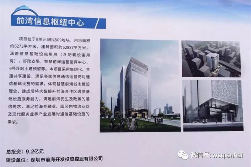 前湾信息枢纽中心项目用地约6273平方米,建筑面积约62887平方米,总投资约9亿元,涵盖信息基础设施用房(含配套设备用房),邮政支局,智慧前海运营指挥中心,6号冷站土建预留等。项目采用集约化、共建共享建设,满足多家信息通信运营商对通信基础设施的需求,体现智慧前海城市建设理念,建成后将大幅提升前海合作区通信基础设施服务能力,满足前海民生及政务的通信需求,满足前海金融业、园区内物流业以及现代服务业等产业发展对通信基础设施的需求。