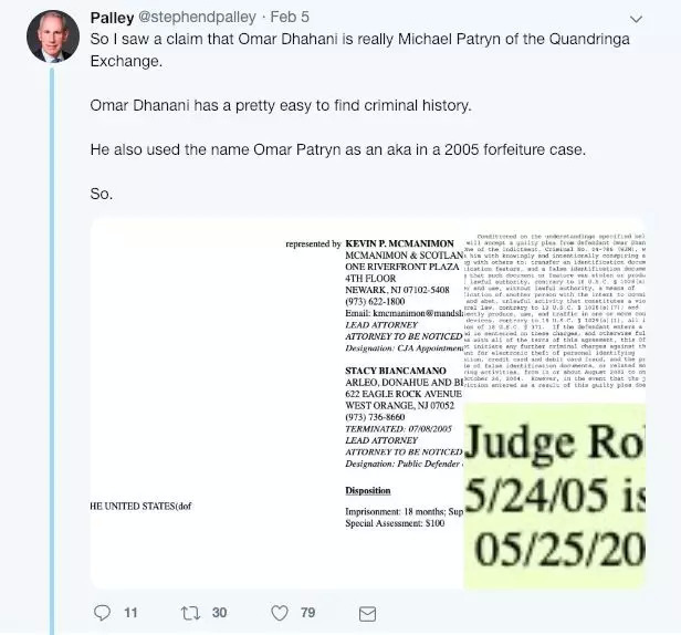 此外有证据显示,Quadriga CX 的联合创始人曾是罪行累累的诈骗犯。律师 Stephen Palley 此前曾在推特上表示,据他得到的可靠消息称,Quadriga CX 的联合创始人 Micheal Patryn 其实还有另一重身份——也就是罪行累累的诈骗犯 Omar Dhanani 的化名。根据可查阅到的犯罪记录,Omar Dhanani 在 2005 年的一个案件中还曾化名为 Omar Patryn。