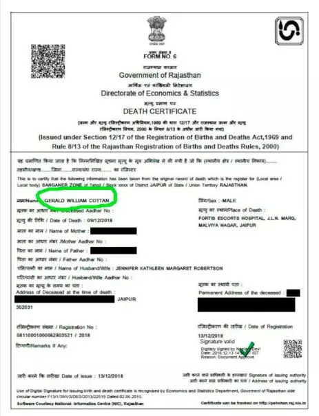 《印度时报》(Times of India) 最近的一篇报道证实,Cotten 确实于 12 月 9 日去世。当地一家殡仪馆的下的「死亡声明」,声明称科顿死于印度斋浦尔,不过殡仪馆以客户的隐私为由,未提供额外信息。他的遗孀获得了死亡证明,警方也获准将他的遗体运回加拿大。