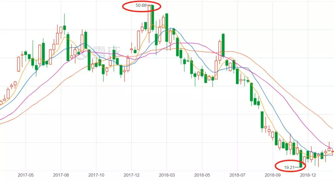 图1:京东股价从最高50.68美元跌至19.21美元,一度游走破发边缘
