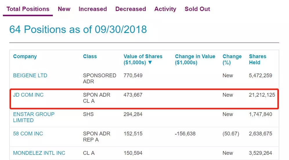 图3:Q218高瓴资本减持京东近6亿美元,截止Q318仅持有约2121万股
