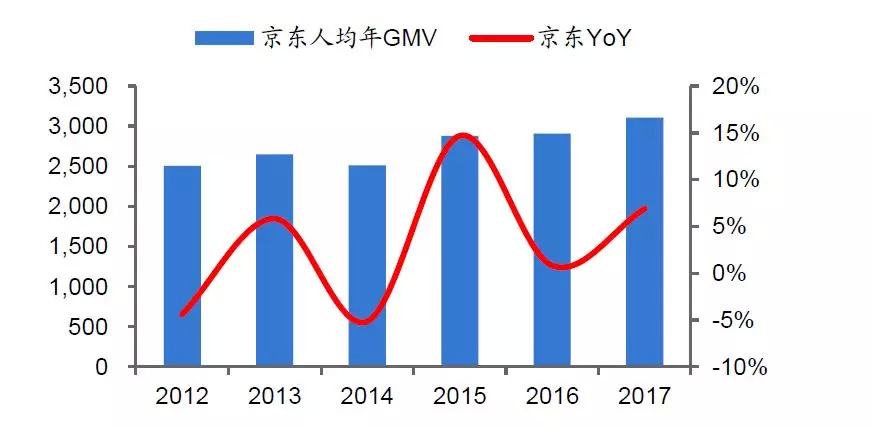 拆分用户数和单用户消费来看,京东过往的规模增长主要由用户数拉动,规模与用户基数扩张较为一致。2012-2017年,京东人均年GMV从2502元上升至3105元(阿里FY2018的人均GMV约8700元),年复合增速仅4.4%,用户增速放缓直接制约京东规模增速。