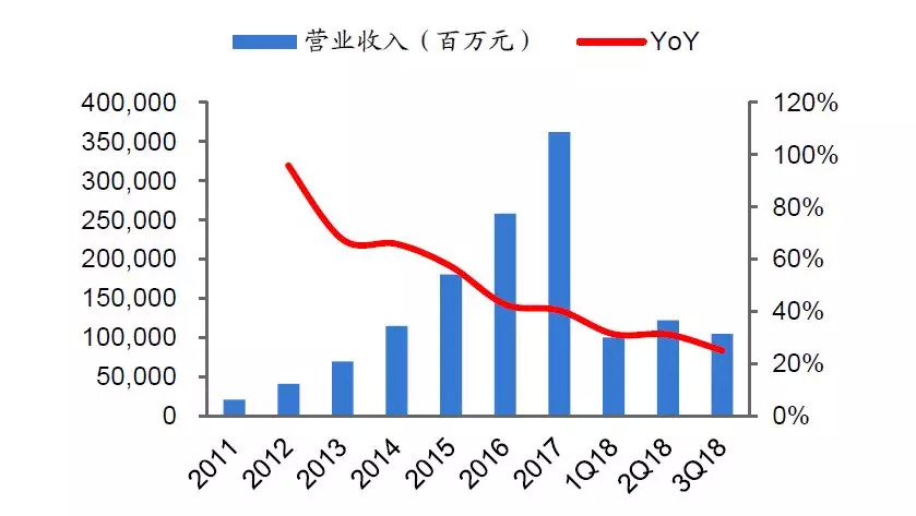 图2:京东3Q18收入增速放缓至25.1%,近9个季度增速首次跌破30%