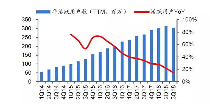 3Q18,京东年化活跃用户规模3.05亿人,同比增速降至14.6%,且首次出现环比下降(2Q18年化活跃用 户数为3.14亿)。我们认为除电商整体用户增速下滑外,京东用户增长放缓更多因其难以将触角渗透至阿里、拼多多等竞品的交叉用户群。