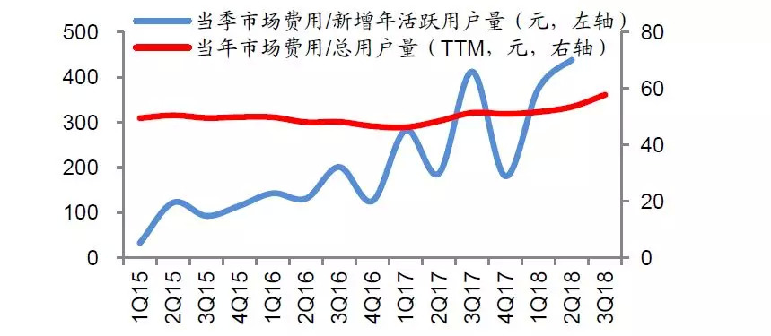 从引流成本来看,全用户口径,3Q18京东年化人均市场费用达到57.8元,较3Q17同比增长12.4%;新增用户口径,2Q18京东引流成本已达438.4元(VS 1Q18为375.4元),16年以来首次环比一季度上升(Q2/Q4电商旺季促销,通常拉新效果好,单位引流成本低)。