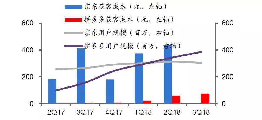 京东自成立以来便以物流为核心的供应链效率见长,自15年“京腾计划”以来,前端营销主要复制了一级入口+广告资源的合作模式。对比同样基于微信生态的拼多多,京东未能摸索出发挥社交流量“分享”属性的有效玩法。京东偏品质化的产品与服务、重资产商业模式,一定程度上也限制其渠道下沉速度。京东用户更多地位于高线级城市,过往京东新通路、京东拼购等多次下沉尝试均未达到理想效果。财务结果来看,3Q18,拼多多年化活跃用户达到3.86亿超越京东,但新客引流成本仅为77.1元,远低于京东438.4元的水平(2Q18)。