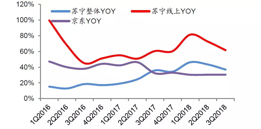 3C家电是是京东起家类目,且是支撑京东过往增长的核心动力。依据云观咨询数据,17年天猫平台器交易规模1914亿元。天猫(13.9%)+苏宁(16%)合计在全渠道电器市场份额到29.6%,超越京东(26.4%)。阿里+苏宁组合兼具规模、流量和全渠道运营优势,且乐于通过价格竞争快速扩大规模。反映到财务数据,17年京东自营电器类增速放缓至35%,同期天猫平台电器类增速49.8%;2015年以来苏宁线上渠道增速始终快于京东,而3Q17以来,苏宁更是全渠道整体GMV增速也持续领先京东。3Q18,苏宁全渠道/线上GMV增速61.7%/37%,京东仅为30.5%。
