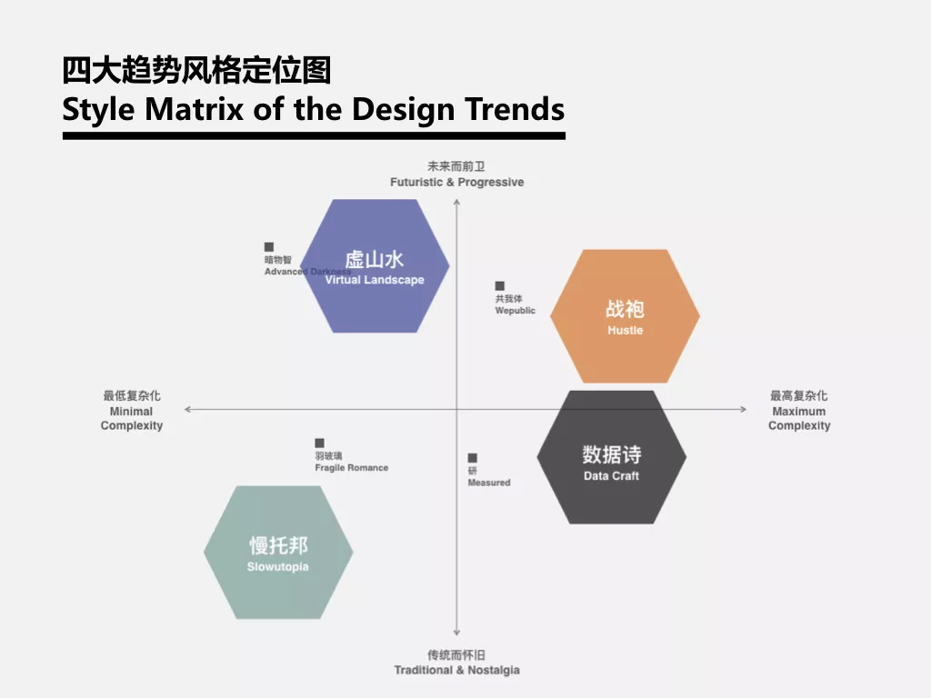 在洞察复杂的中国本土市场后,2019年 YANG DESIGN《中国设计趋势报告》,一如既往从CMF(即Color颜色、Material材料、Finish表面处理)三方面为品牌和企业带来设计趋势的前瞻。今年,YANG DESIGN提出了两个走向虚拟和真实极端的趋势--战袍、慢托邦,也提出了两个尝试融合虚拟和真实的趋势--虚山水、数据诗。