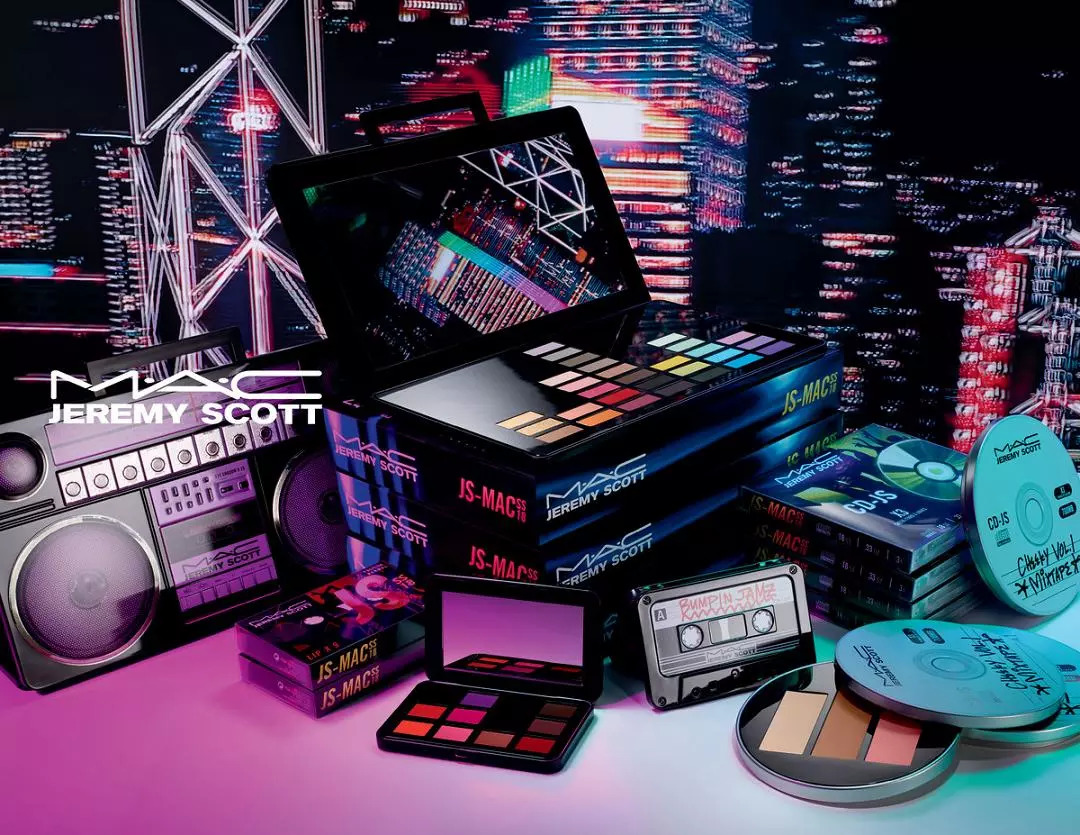 受到这一社会文化因素影响,出现了结合复古与未来审美的产品,如采用的镭射感M.A.C MIRAGE NOIR彩妆系列和PREP+PRIME系列。整个外壳包装设计犹如一款针对科幻电影爱好者的潮流IP产品,幻彩及黑色珠光杂点效果,搭配高反光的质感。 M.A.C与Jeremy Scott推出的产品包装则模仿了复古音乐磁带、CD。