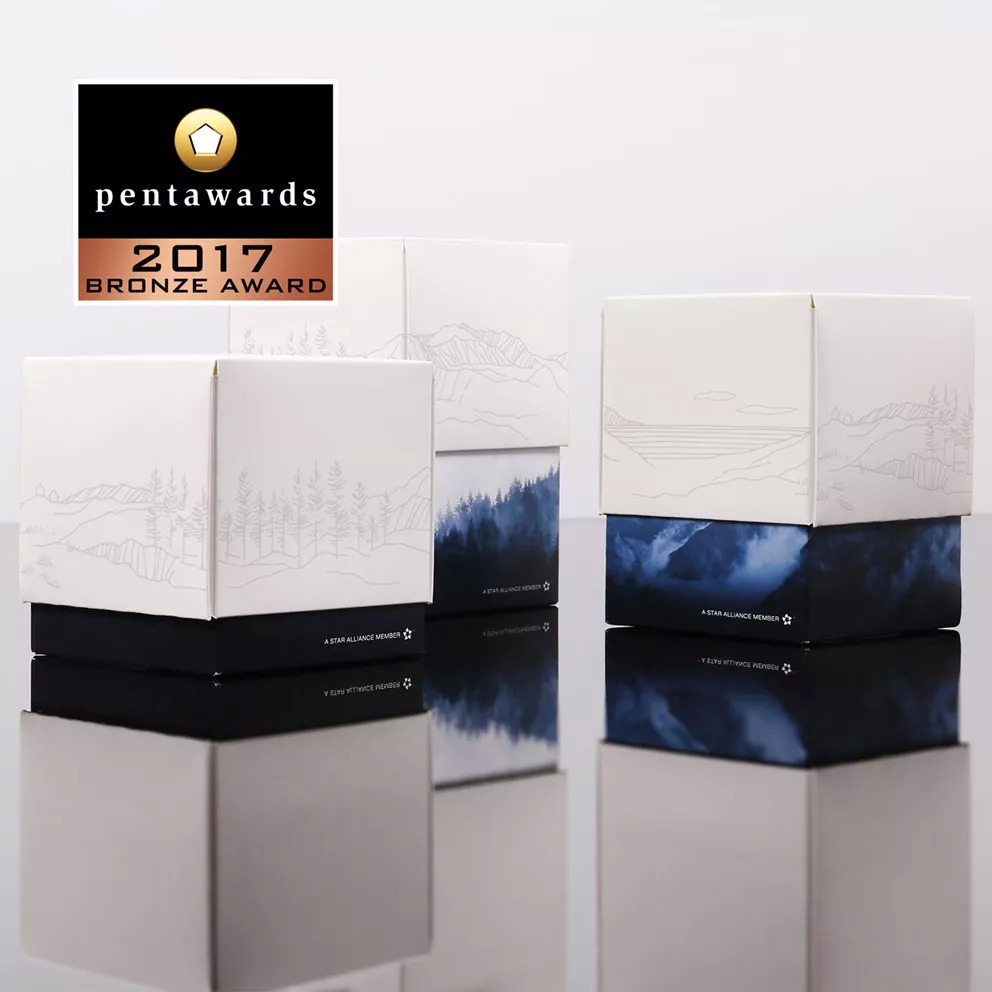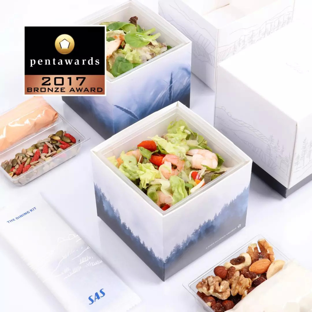北欧航空的餐盒包装设计利用了上下开合的结构做色彩分割,以白描、渲染分布展现了山中树林的两种状态,整体呈现的禅意宁静的风格。