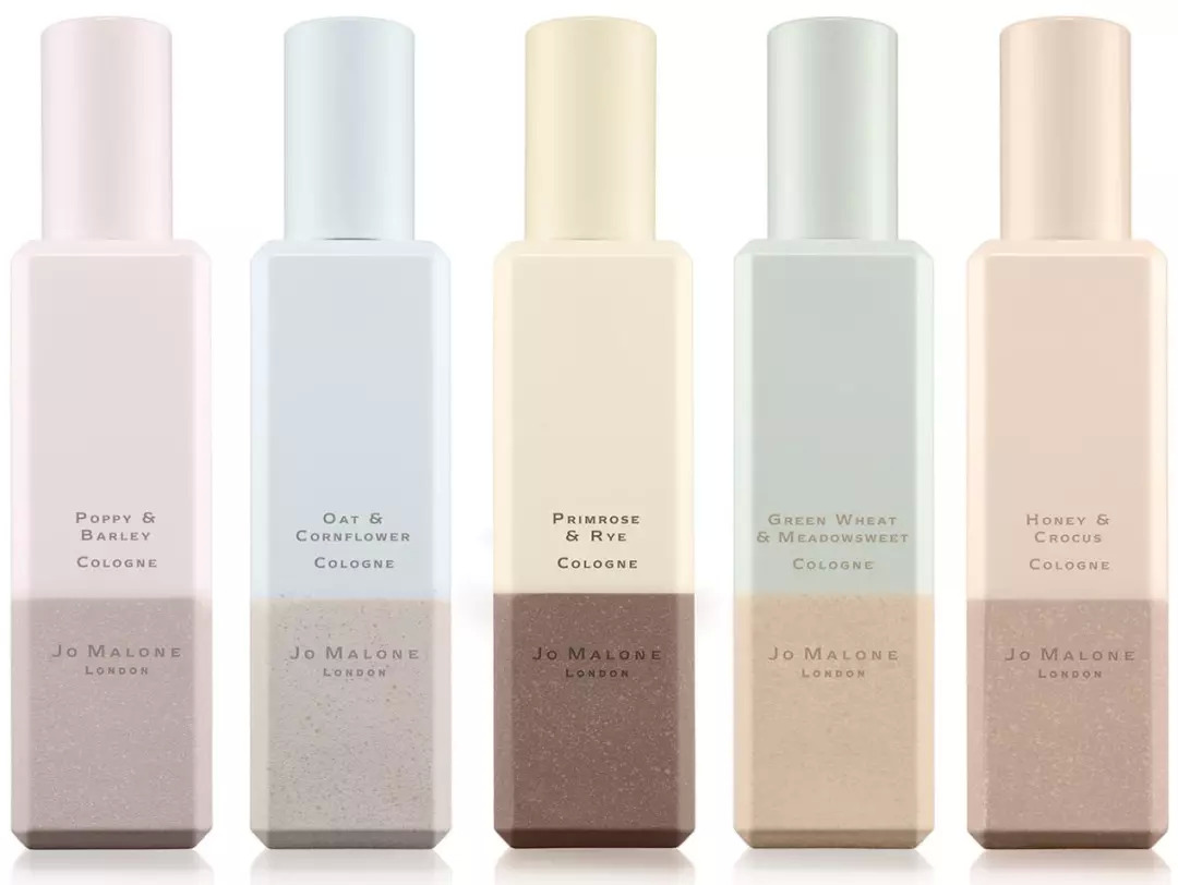 慢托邦的色彩主题是中彩度、高明度的温暖淡色调显得柔和、惬意、治愈、健康。绿植和干花让人卸下疲惫,让眼睛喘息。Jo Malone的 English Fields系列产品把田园里的植物色彩和仿水磨石纹理重新进行了搭配,呈现出清新纯净、自然的风格。外包装则十分有创意地模仿了棉麻围裙的设计。