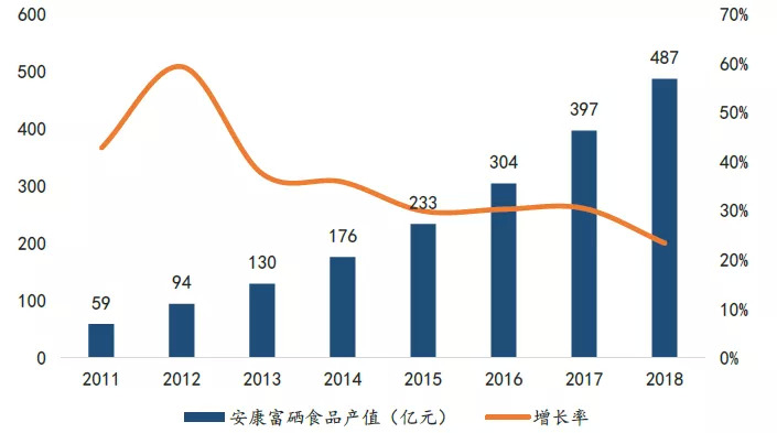 2011年以来,安康市经济年均增长超过12%,成为全省发展最快的市。在这背后,富硒产业的发展功不可没。从2011年开始,安康富硒食品产业一直保持30%左右的高速增长,2018年富硒食品产值更是达到487亿元,对规模以上工业产值贡献率达30.5%,占全市六大支柱工业总产值的36.6%。连同第一产业中的富硒种养产业,富硒产业总规模已超600亿元。