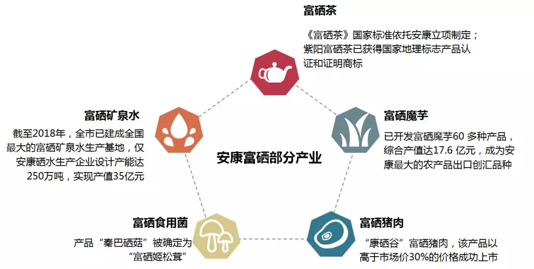 依托富硒资源、优良生态和科研优势,安康大力推进“硒+X”战略,通过做优“硒+农业”、提升“硒+工业”、开发“硒+养生旅游”,促进安康经济由产品经济向服务经济转变、富硒农业向富硒产业转变。