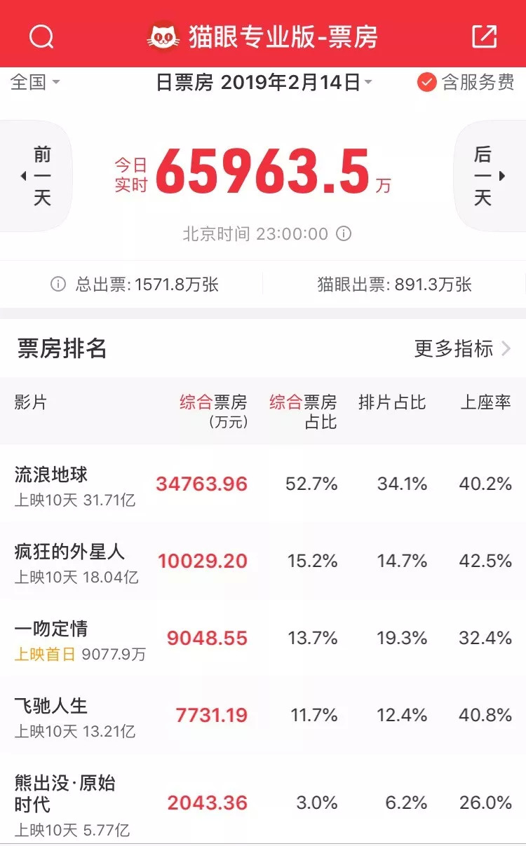 今年的情人节在正月初十,并没有完全走出春节档的余热,所以虽然当日票房超过6亿人民币,再创情人节当日票房纪录,但是单日票房前两位分别被《流浪地球》《疯狂的外星人》占据,其中《流浪地球》更是贡献单日票房的52.7%。