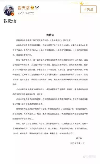 相继看到翟博士的道歉信、北京电影学院和北大纷纷表态后,翟天临涉嫌学术不端事件感觉将进入一个新阶段阶段。