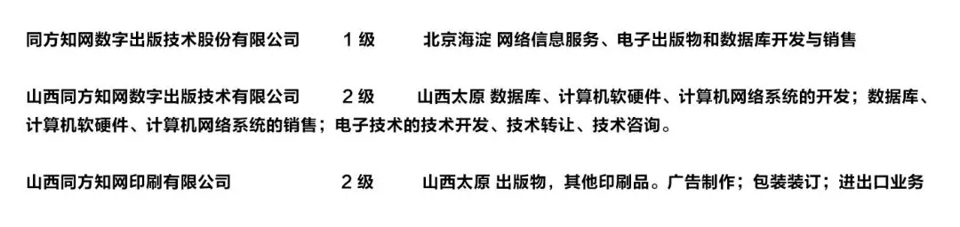上述这5家公司均由同方股份100%持股。其中最主要的主体应该是同方知网数字出版技术股份有限公司,因为公告里说它是“重要一级控参子公司”。这家公司的主要业务是网络信息服务、电子出版物和数据库开发与销售。