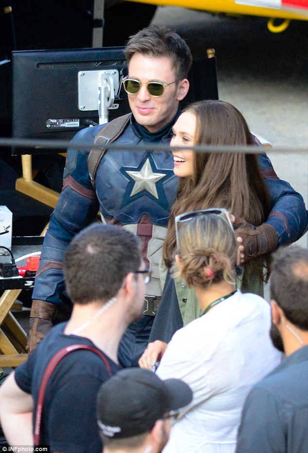 克里斯·埃文斯穿着他那标志性的红白蓝三色的装束,但他脱掉了美国队长的头盔,换上了一副更有型的墨镜与二十六岁的伊丽莎白·奥尔森击掌,并时不时搂着对方的肩膀。伊丽莎白·奥尔森在这部电影里再度饰演可以扭曲现实的绯红女巫。