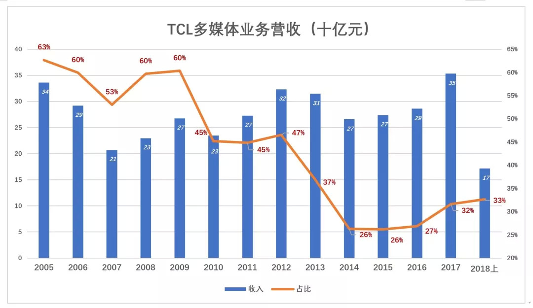 TCL多媒体业务滞涨是不争的事实。2005年该板块收入336亿,占总营收的63%。2007年收入跌至207亿,占营收的53%。又过了十年,2017年TCL多媒体业务收入不过353亿,较2005年增长5%,折合年均增长0.4%!