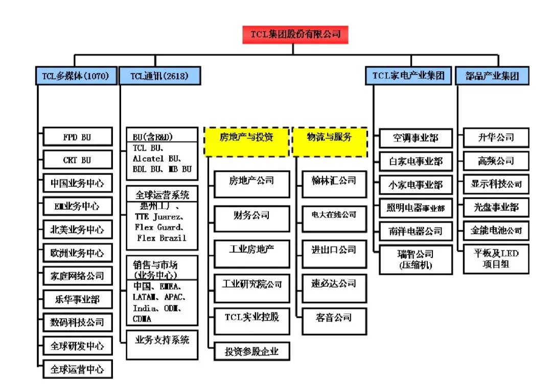 又经过十年的蹉跎岁月,TCL战线收缩,业务架构精简为“6+3+1”,即6类产品(多媒体、通讯、家电、面板、通力电子及商用产品)、3项服务(互联网应用、销售及物流、金融业务)和创投。