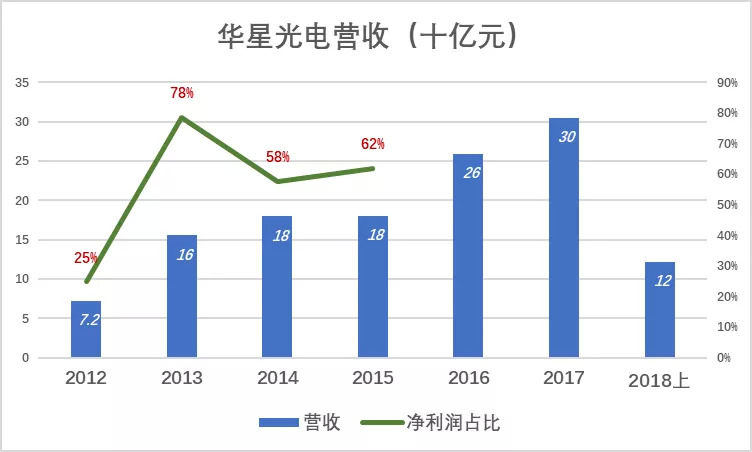 TCL投资的8.5代液晶面板项目于2011年10月开始量产,陆续产出28吋、32吋、37吋、46吋、55吋、110吋液晶面板和模组。在为TCL多媒体之外亦为国内外整机厂提供配套,2012年营收72.4亿,净利润3.15亿。2013年、2014年,华星光电销售收入分别为155.3亿和179.6亿,净利润分别为22.6亿和24.3亿。TCL集团效益从此大为改观,2013年华星光电净利润相当于集团净利润的78%,2015年时相当于62%。