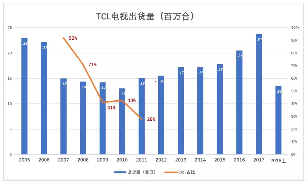 2006-2012年这五六年间,彩电行业经历了从CRT(显像管电视)到平板电视的革命。TCL的产品结构发生了翻天覆地的变化,CRT占比从100%跌到71%(2008年)、再到28%(2011年)。从2012年开始,TCL不再披露CRT的出货量,估计其产品已经完全平板化了。2018年上半年,TCL液晶电视销量1351万台,其中海外市场销量828万台、占比61.3%。