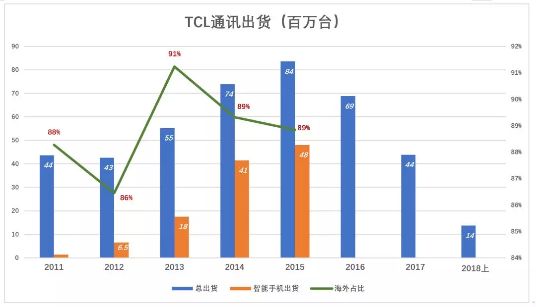 TCL通讯将手机、手机配件、数据卡销量打包在一起披露。2005年总出货量为1090万台;2011年总出货量4362万台,其中智能手机137万台(这是TCL首次披露智能手机销量);2015年,总出货量达到创纪录的8355万台,其中智能手机4800万台;2016年起总出货量急剧下滑,2018年上半年仅为1371万台,同比下降35.3%。