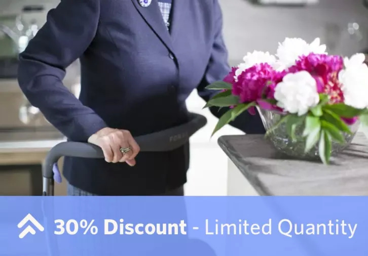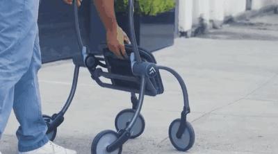 具备专利技术,伸缩系统不仅可用于调节高度范围,还可直接彻底缩入,迅速收纳车轮,快速折叠并锁定,使其体积比同类全尺寸助行器减少 60% 。