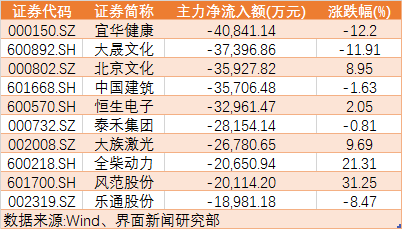 在本周主力资金持续净流出个股中,共计27只个股累计主力资金净流出额超过1亿元。这其中,宜华健康(000150.SZ)、大晟文化(600892.SH)、北京文化(000802.SZ)等个股本周遭主力抛售幅度最大,其累计净流出额分别为4.08亿元、3.74亿元、3.59亿元。