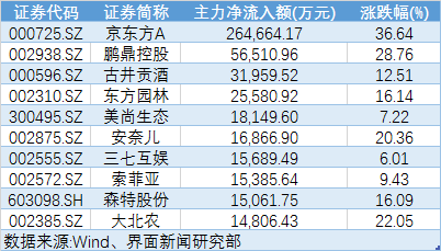 Wind提供的数据显示,本周获主力资金持续净流入且五日累计净流入额超过1亿元的个股共有11只。其中,京东方A(000725.SZ)、鹏鼎控股(002938.SZ)、古井贡酒(000596.SZ)本周累计净流入额居前,分别为26.47亿元、5.65亿元、3.20亿元。