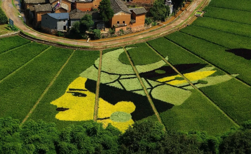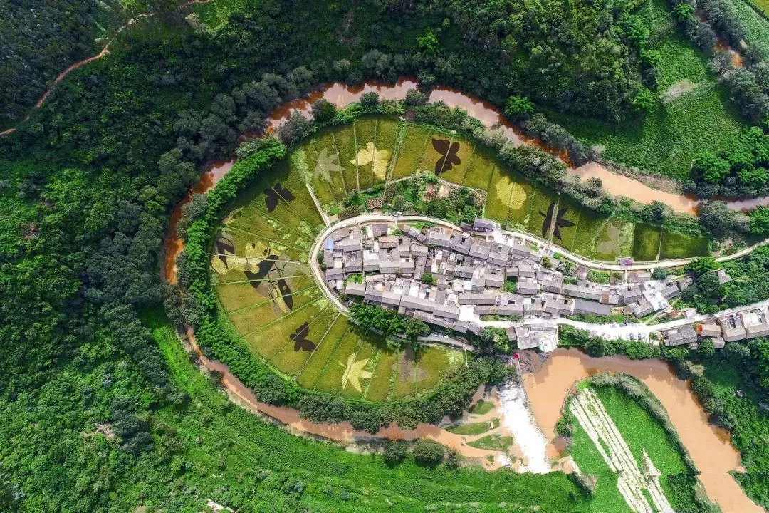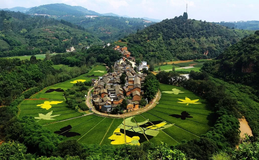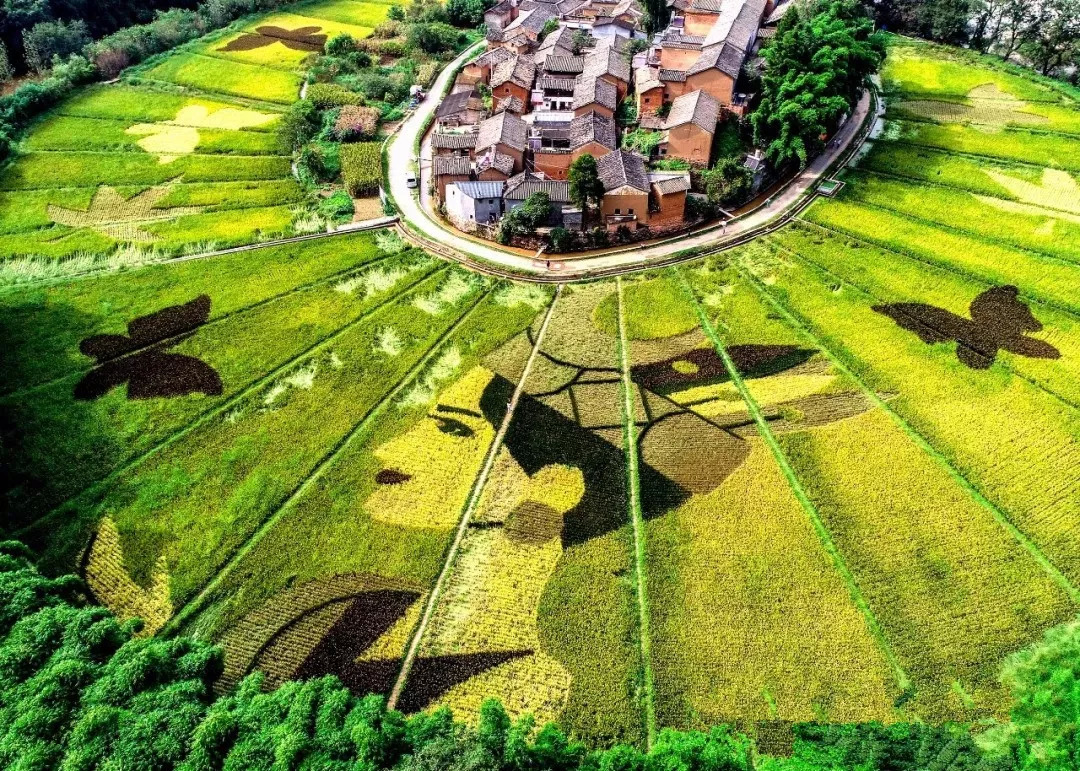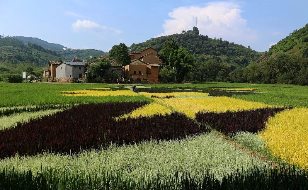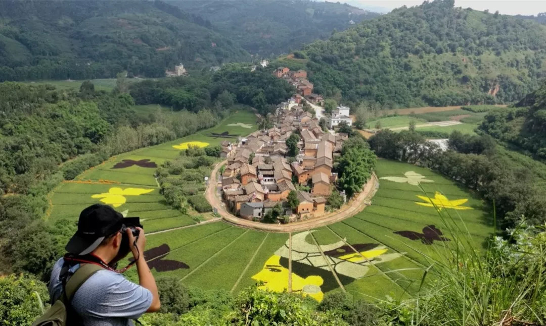 如今,村里又有了一个特色,那就是种上了带有图案的稻田,就像画家的调色板。每当稻谷成熟的季节,彝族姑娘走在田头,让人流连忘返。