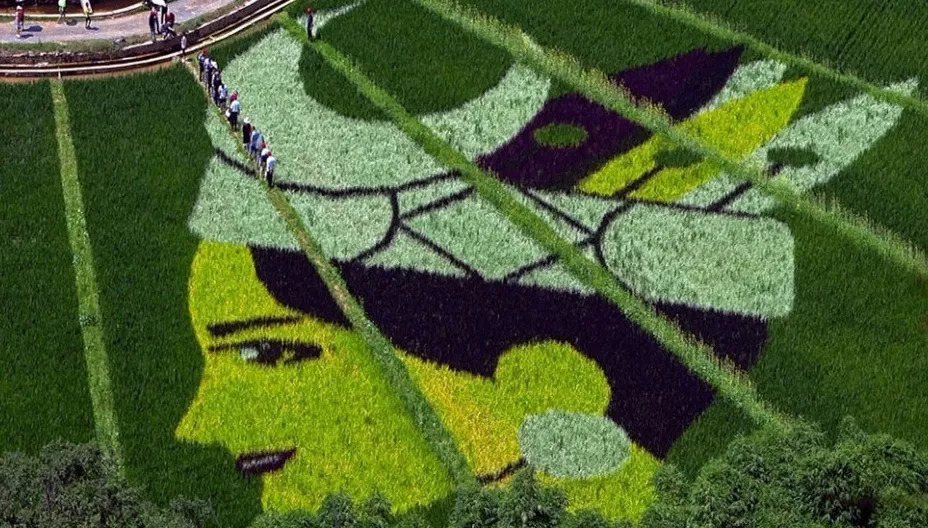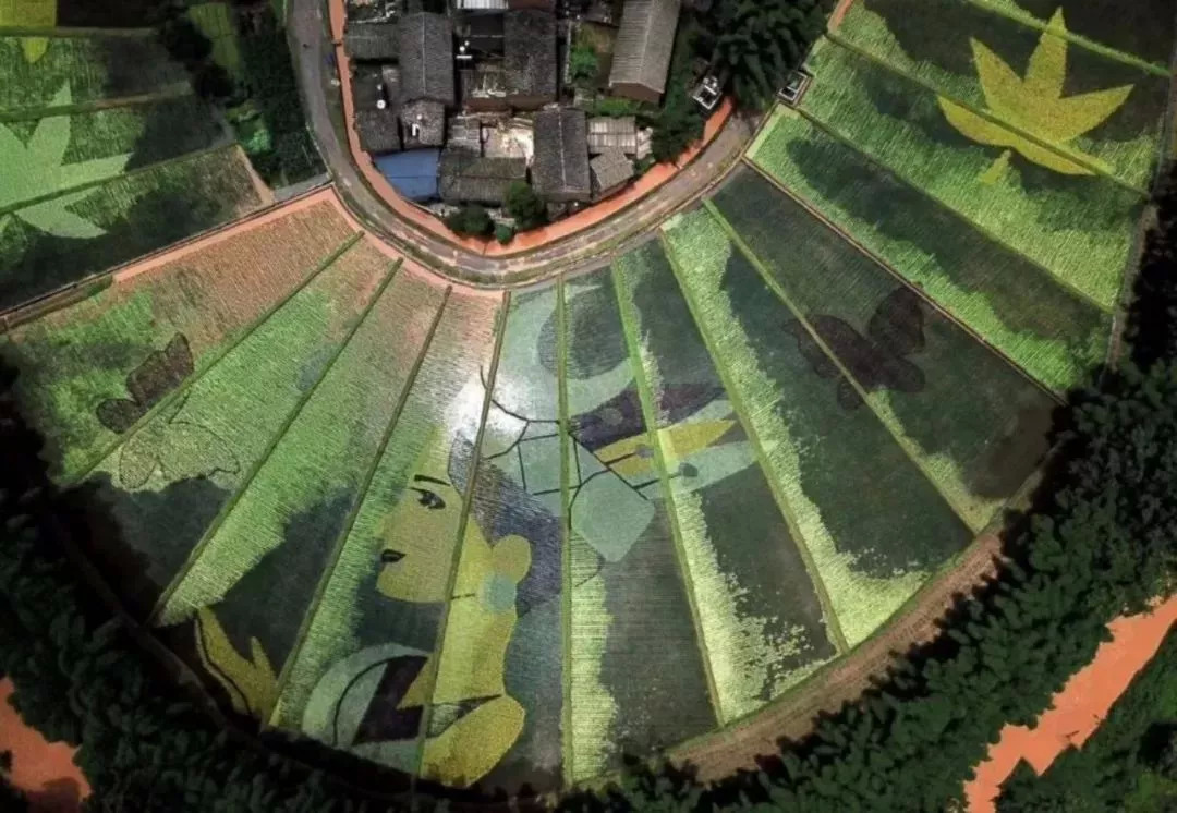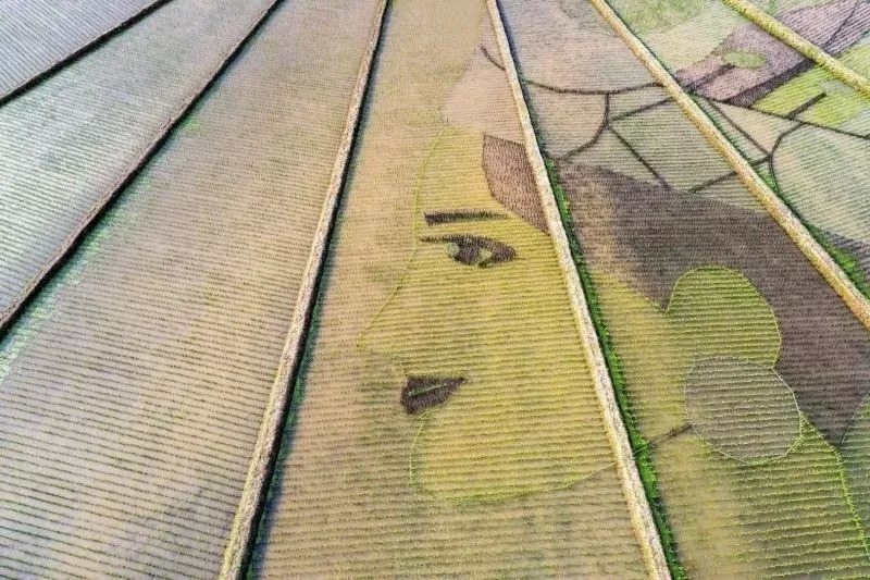 看到这幅画,就会想起英国“麦田怪圈”,但河湾村稻田里的仰阿莎,可不是拿颜料涂出来的,而是靠彩色水稻组成。