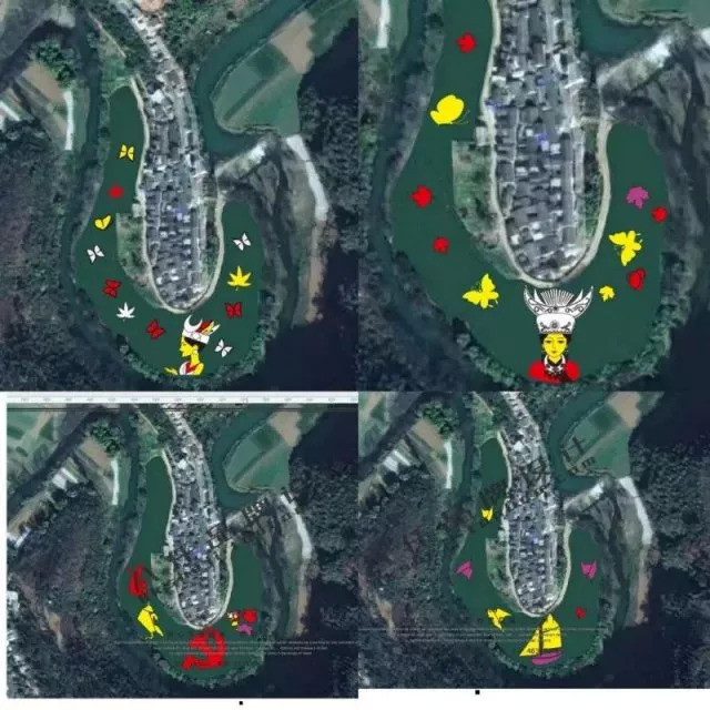 下面这 4 副图是基本定稿后发出来征求意见的。经过网络投票,最终 " 苗族美神‘仰阿莎’之引枫蝶舞 " 图案高票入选!