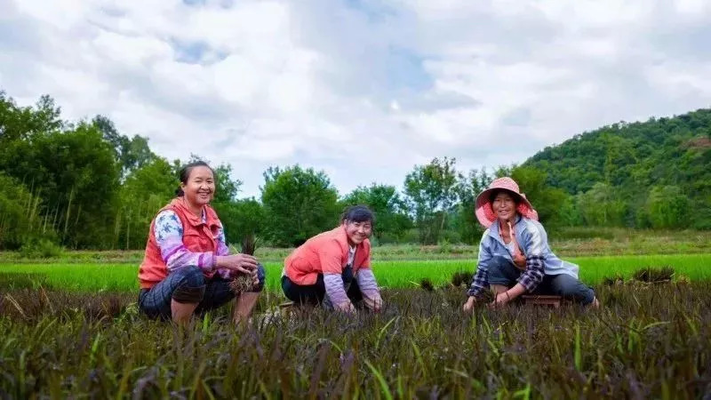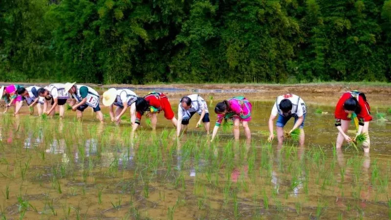 拔秧也是一个技术活哟,尤其是拔彩色水稻秧苗,拔秧→拣秧→扎把,既要速度又不能缺眼力!阿哥和阿妹比赛插秧,比一比,看一看,看谁插的好又快!