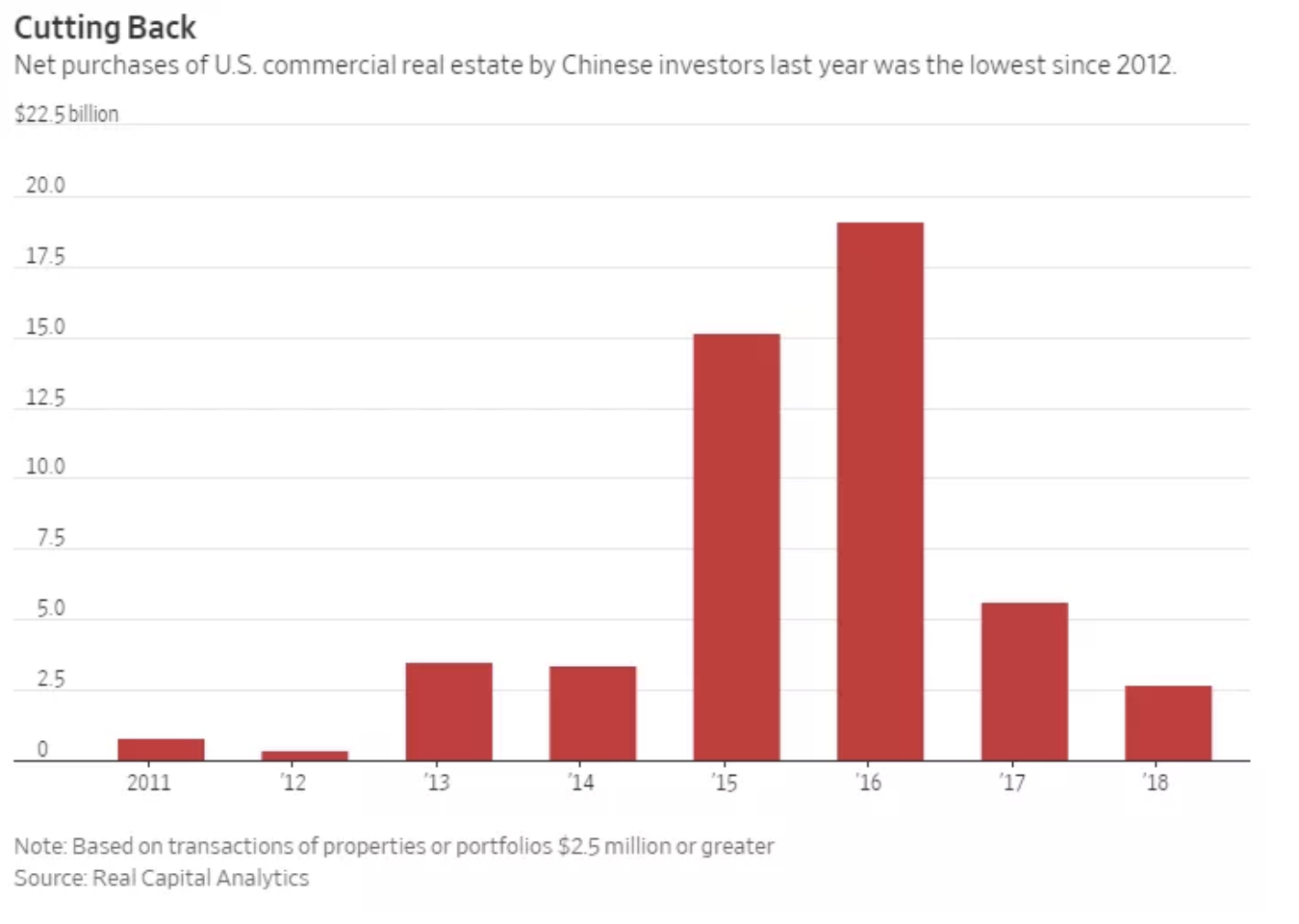 2018年全年,中国投资者净买入26.3亿美元的美国房地产,为六年来最低水平。