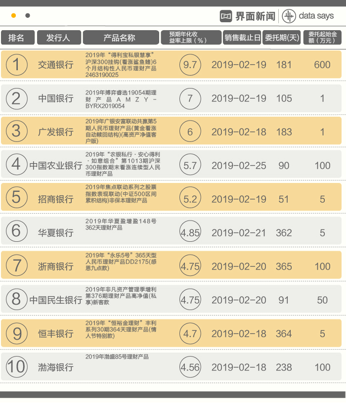 本周排在榜首的是交通银行2019年“得利宝私银慧享”沪深300挂钩(看涨鲨鱼鳍)6个月结构性人民币理财产品。产品最高预期年化收益率为9.7%,委托期181天。这个系列的产品不单纯看涨沪深300指数,要是到期时沪深300指数小于等于起息日时指数,收益仅为2.5%;但要是指数涨得太高,曾在委托期间超过了起息日指数9个点,收益便锁定为5.2%;当指数在上浮9个点以下、起息日时指数以上的区间波动时,到期时收盘价越高则收益越高。产品600万元起,门槛较高。对于交行私人银行客户,起投门槛为20万元。