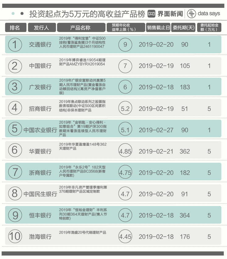 考虑到投资者的拟投资金额、风险偏好不同,本期还对起点为1至5万元的银行理财产品以及抛去结构化产品收益复杂设置、收益相对稳定的非结构类理财产品进行筛选,做成榜单,供投资者参考。