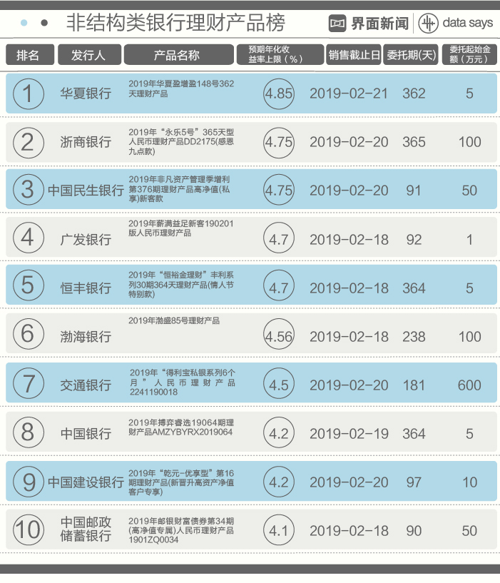 来看看本周有哪些可以挑选的银行理财产品。本周,18家国有商业银行和股份制商业银行全国范围在售针对个人的人民币理财产品222只,其中未包含结构性存款银行理财。界面新闻从每家筛选了收益率最高、最值得关注的理财产品,共10只。