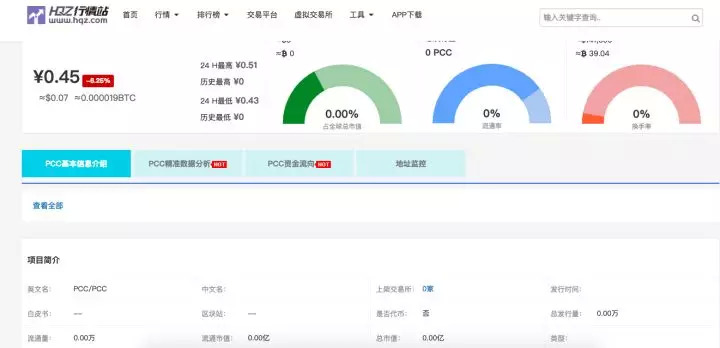 区块律动 BlockBeats 查询到,即使在业内公认的数据统计机构——Coinmarketcap 上,都查不到 pcc 的相关信息。而能查到的 hqz 观察站中,除了价格,其他项目介绍信息一片空白。