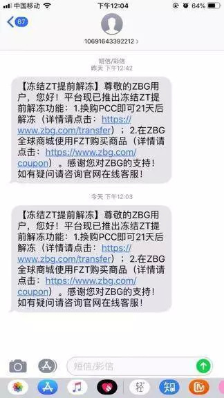 ZBG 对此一直没做出什么反应,直到进入 2019 年 1 月,开始突然给每个人手机发短信。宣传 ZBG 官方出台了 zt 兑换代币 pcc 的活动。pcc 只在 ZBG 上交易,用何先生的话来说,「这是个只在 ZBG 的单机币」。