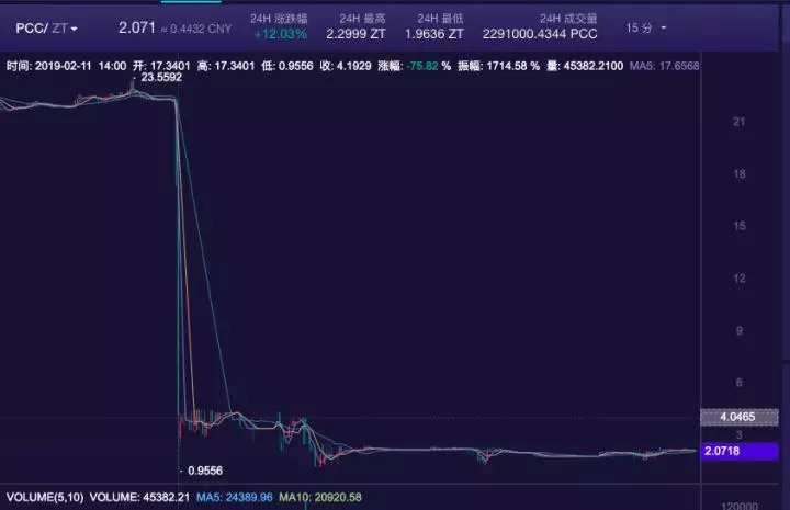 2 月 11 日下午 14 时,第一批置换的人到了解锁时间,诡异的事情发生了。所有原来交易簿上的订单全部撤走了,直接变最低价 0.9556 元,并且买单为 0。也就是说,在换币解除锁定的第一时间,pcc 交易在某种神秘力量下被控制,价格暴跌 95%,买家全部消失。