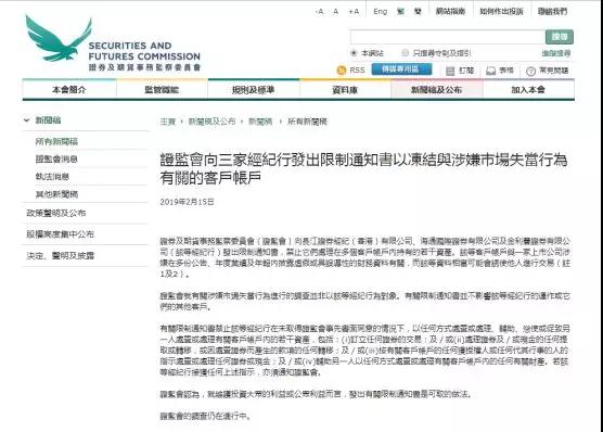 2月15日,港证监证券及期货事务监察委员会向长江证券(香港)、海通国际及金利丰证券三家券商发出限制通知书,禁止它们处理在多个客户账户内持有的若干资产。