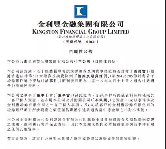 去年9月17日,港证监向三家证券行发出通知,包括金利丰证券、中南金融、及汇丰金融证券(亚洲),禁止有关经纪行在未得证监会事先书面同意下,以任何方式处置有关客户账户内的任何资产,以总值101.68亿港元为限。