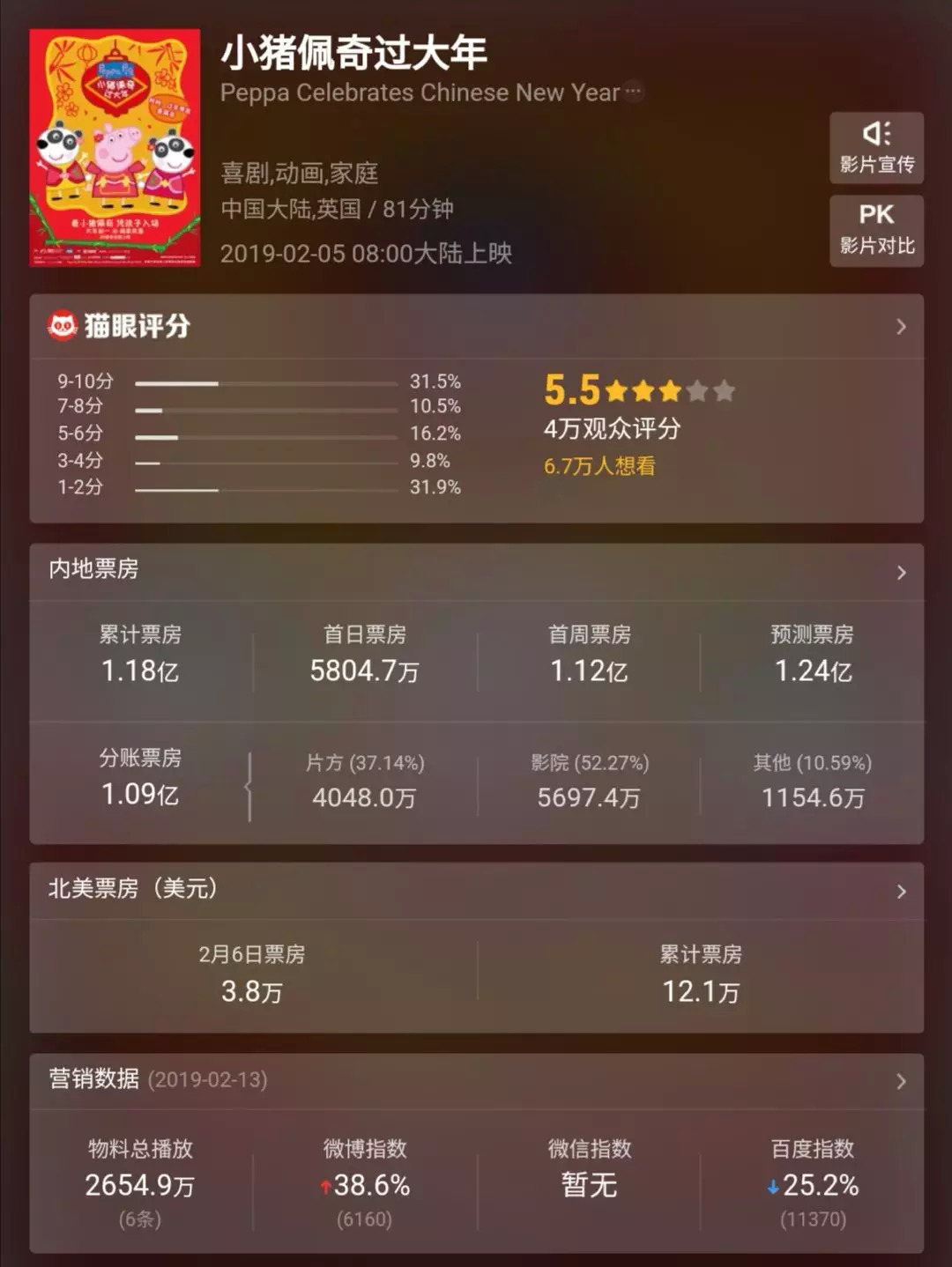 但与广受好评的跨界营销《啥是佩奇》相比,电影《小猪佩奇过大年》的大众评价却是急转直下。截止麻辣娱投记者写稿前,电影《小猪佩奇过大年》豆瓣评分仅为5.5,各类影评差评不断,累计票房刚过1亿,处于同贺岁档中末尾。