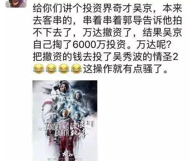 《流浪地球》还有一个插曲,吴京本来只是客串,后来导演告诉由于投资方撤资了,电影拍不下去,结果吴京二话不说自己掏了6000万投资,最终影片才得以面世。