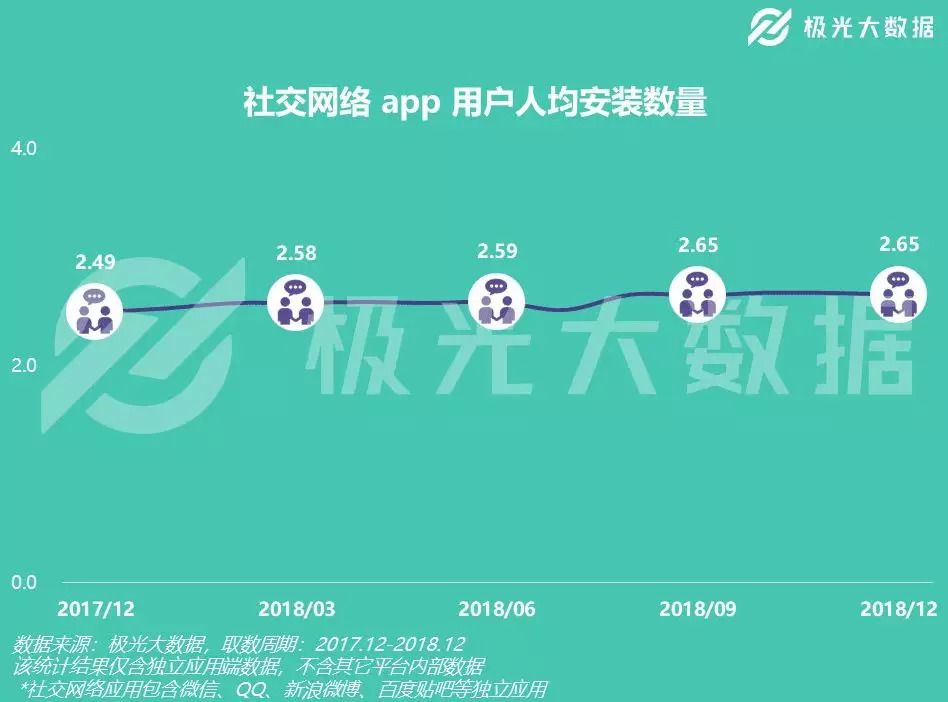 在为期一年的观察期内,社交网络app的用户人均安装数量有所上升。截至18年12月,社交网络app的用户人均安装数量为2.65款,较17年同期增长6.4%。