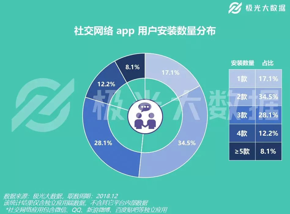 用户安装数量分布显示,截至18年12月,有17.1%的用户仅安装1款社交网络app,安装数量为2款和3款的用户占比分别为34.5%和28.1%。与此同时,也有20.3%用户的安装数量在4款及以上,是重度社交app用户。