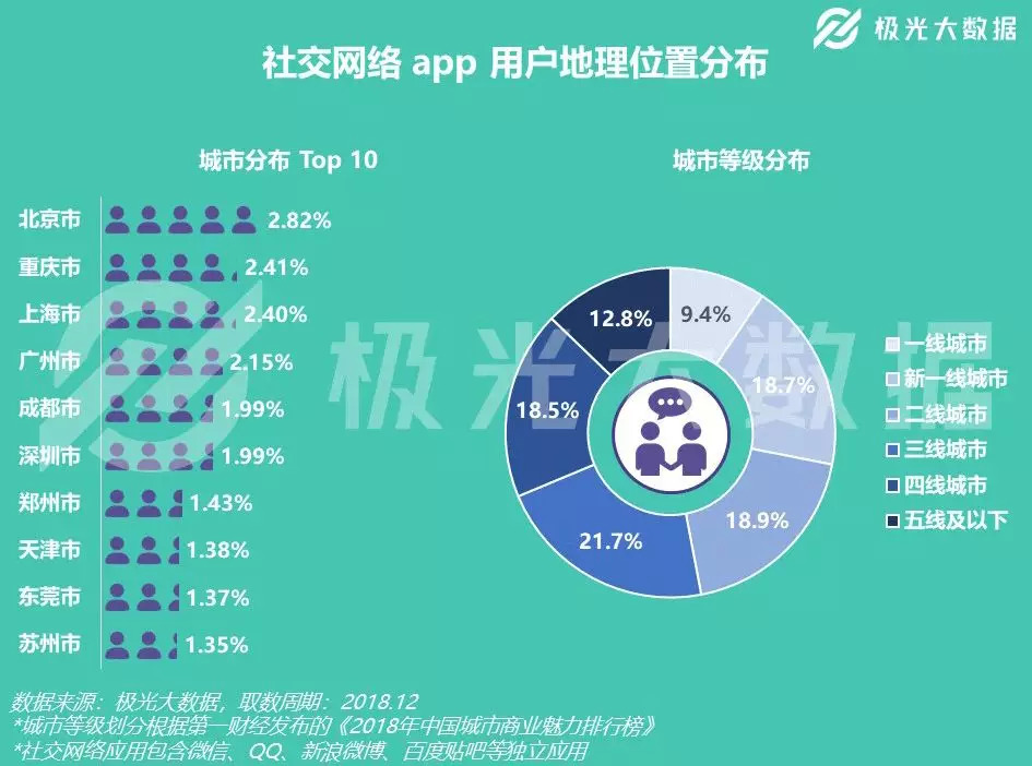 在社交网络app中,用户占比最高的依次是北京(2.82%)、重庆(2.41%)和上海(2.4%),其次为广州(2.15%)、成都(1.99%)和深圳(1.99%)。